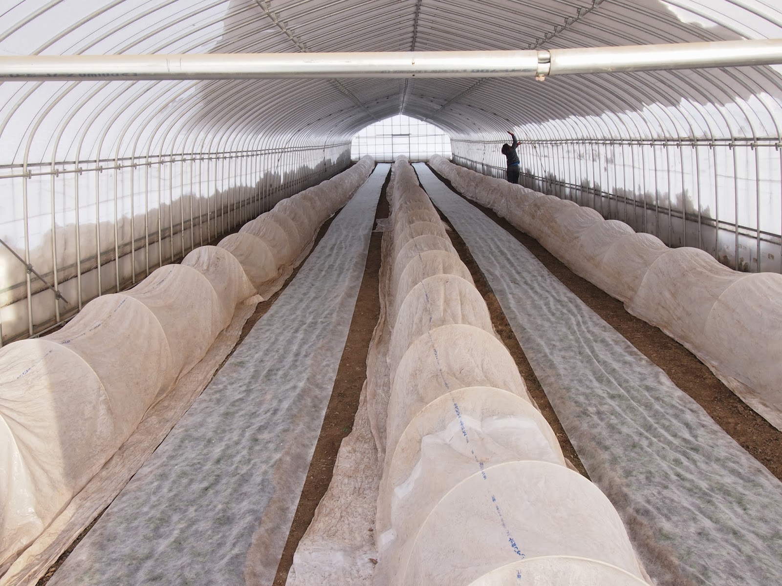 雪の重さに耐える越冬用の太いパイプを使ったビニールハウスです。