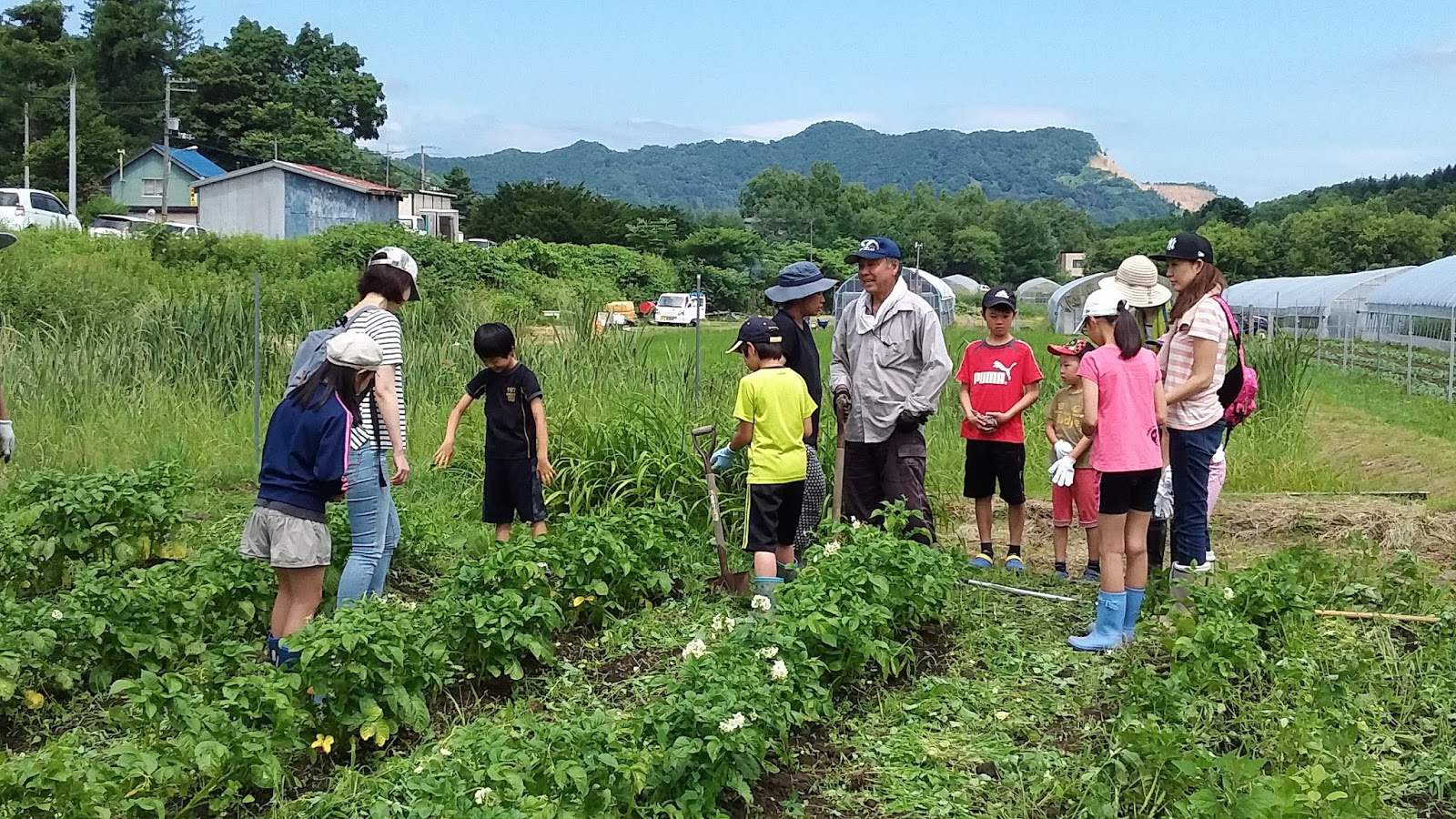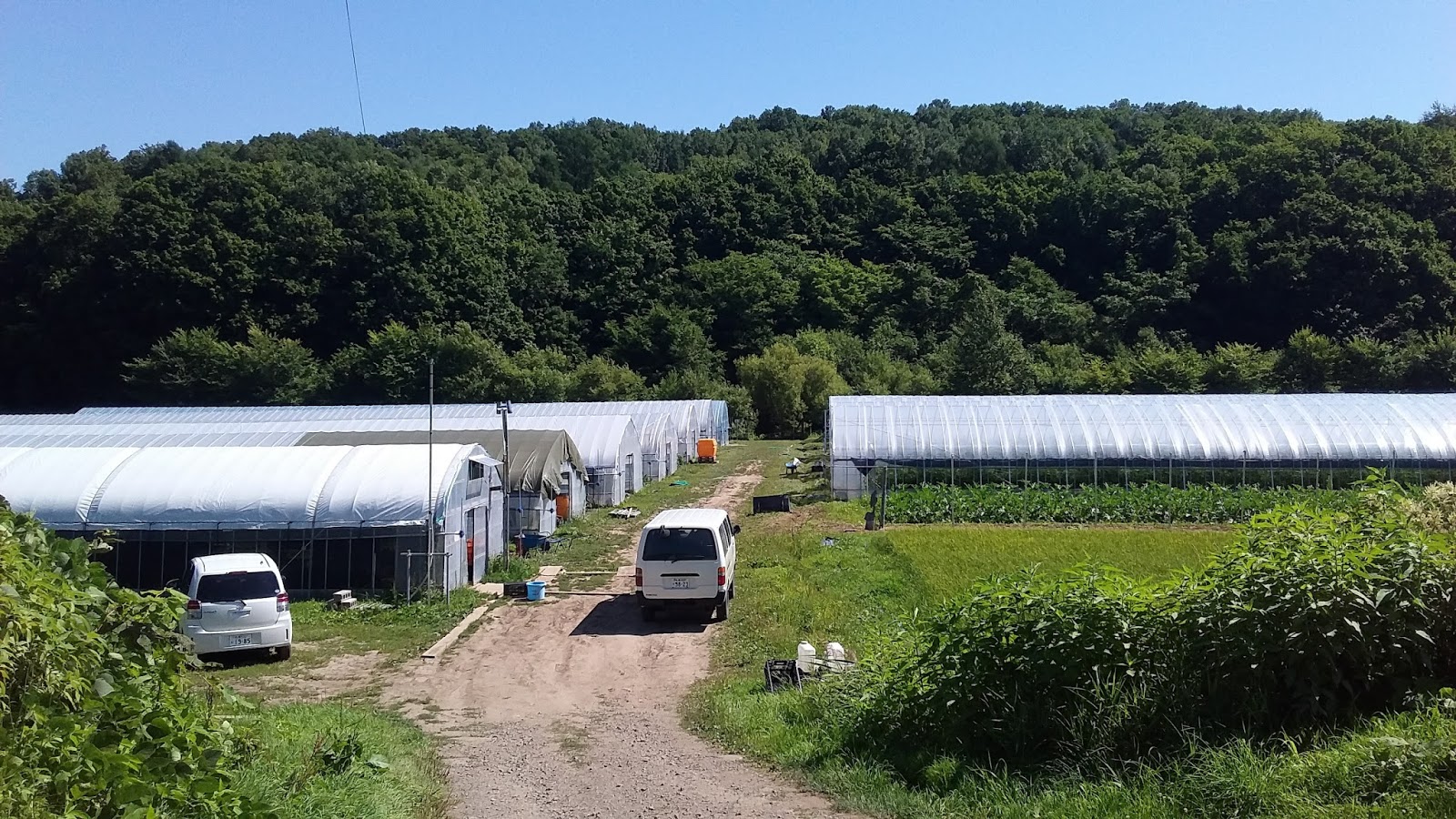 ちょっとわかりづらいですが、左一番奥に1棟、右奥にも1棟と2棟新設し、営農計画第1段階の目標である計10棟の栽培用ハウスとなりました。
