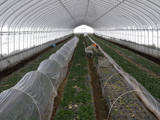 真冬の雪の中ながら、ビニールハウスの中にさらにビニールのトンネルを張り育てています